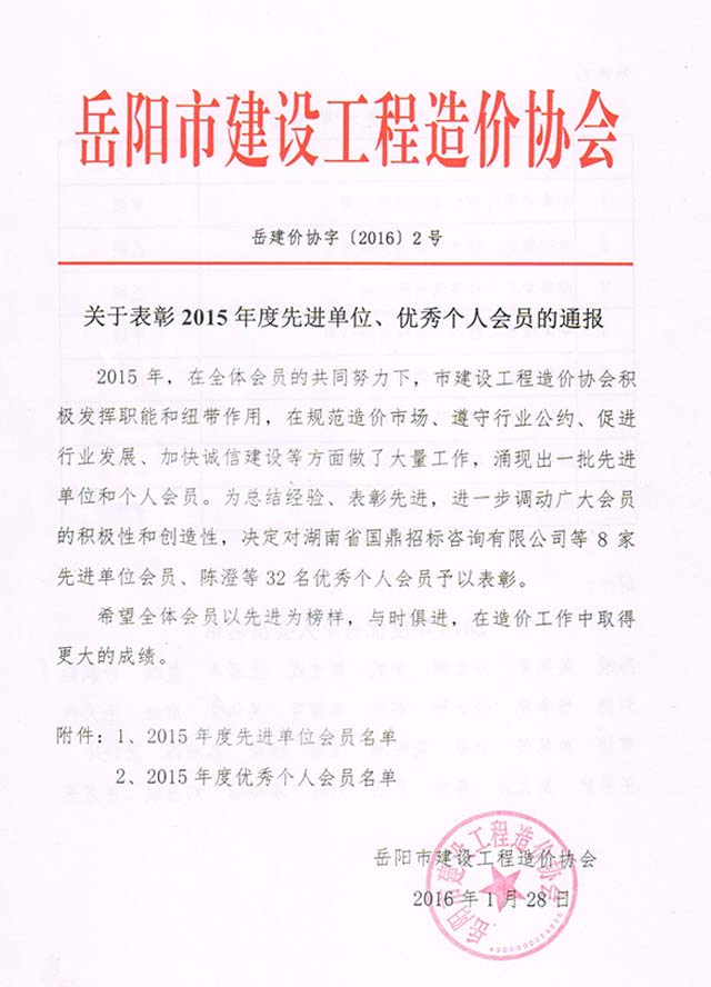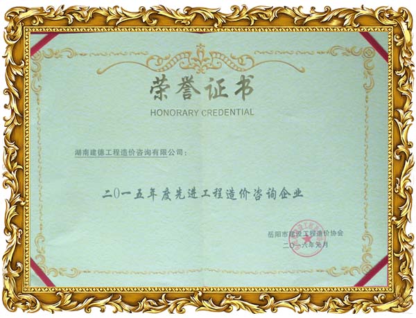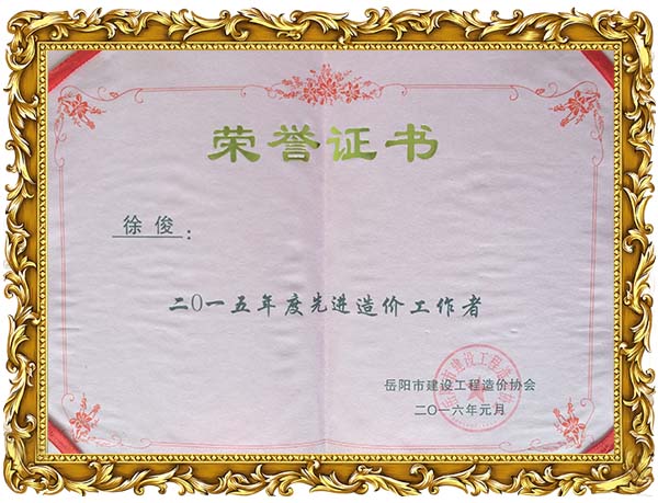 我公司榮獲2015年度岳陽市工程造價協(xié)會先進(jìn)單位榮譽(yù),同時徐俊,倪娟榮獲岳陽市造價協(xié)會2015年度優(yōu)秀個人榮譽(yù)。